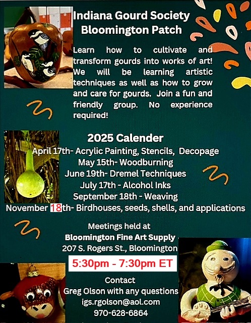 09-21-25: 2-4 p.m. ET, Linda's Gourd Patch (Greenfield): TBD 10-07-25: 2-4 p.m. ET, Sugar Creek Gourd Patch (Thorntown): Turkeys on bales of straw 10-08-25: 2-4 p.m. ET, Central Indiana Patch (Indy): Prep for IGS State Gourd Show 10-16-25: 1-3 p.m. ET, Bloomington Gourd Patch (Bloomington): NO MEETING 10-19-25: 2-4 p.m. ET, Linda's Gourd Patch (Greenfield): TBD 10-21-25: 2-4 p.m. ET, Sugar Creek Gourd Patch (Thorntown): Turkeys on bales of straw 11-18-25: 5:30-7:30 p.m. ET, Bloomington Gourd Patch (Bloomington): birdhouses/seeds/shells Click here |